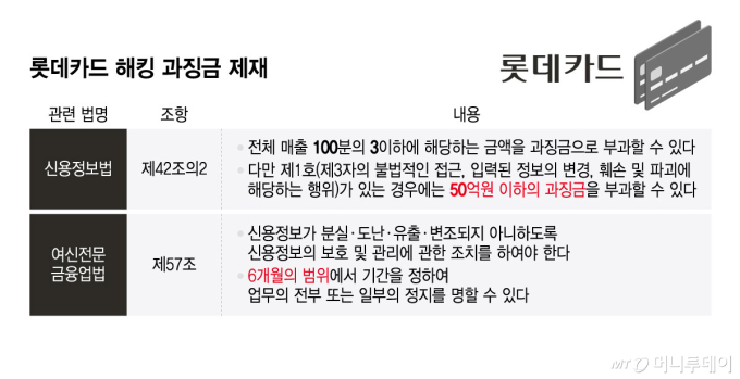 ·Ôµ¥Ä«µå´Â ÀÌ¹Ì »çÀü Á¦Àç¾ÈÀ» Å뺸¹ÞÀº °ÍÀ¸·Î ¾Ë·ÁÁ³´Ù. °ú¡±ÝÀº ÃÖ´ë 50¾ï¿øÀÌ ºÎ°úµÉ Àü¸ÁÀÌ´Ù. ½Å¿ëÁ¤º¸¹ý¿¡ µû¸£¸é °³ÀÎÁ¤º¸¸¦ ºÐ½Ç¡¤µµ³¡¤´©Ã⡤º¯Á¶ ¹× ÈѼÕÇϸé Àüü ¸ÅÃâ 3% ÀÌÇÏ¿¡ ÇØ´çÇÏ´Â °ú¡±ÝÀÌ ºÎ°úµÈ´Ù. ÇÏÁö¸¸ ´Ü¼ Á¶Ç׿¡ µû¶ó ¿ÜºÎ ÇØÅ·À̳ª ºÐ½Ç µî Á¦3ÀÚÀÇ ºÒ¹ýÀûÀÎ Á¢±ÙÀ¸·Î Á¤º¸°¡ À¯ÃâµÇ¸é 50¾ï¿ø ÀÌÇÏ °ú¡±ÝÀ» ºÎ°ú¹Þ´Â´Ù.